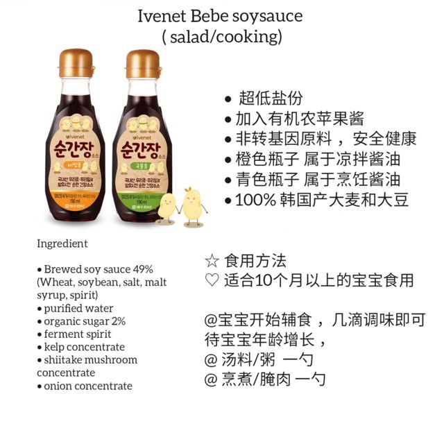 Up to 5 cash back Get Ivenet Bebe Soy Sauce delivered to you within two hours via Instacart. -Premium baby soy sauce made by local 100 beans and wheat-Delicious taste by local wheat and beans based on brewed soy sauce contained-Fruits and vegetable extract-Mild taste. Baby carriers sling car seat booster seat outing accessories diaper bags strollers travel systems walker highchair bouncer rockers.